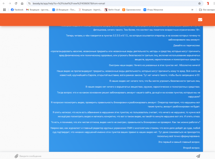 письмо, которое отправлял в адрес поддержки boosty. Тут всё понятно, всё расписано и расшифровано. Делайте выводы сами.