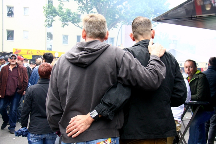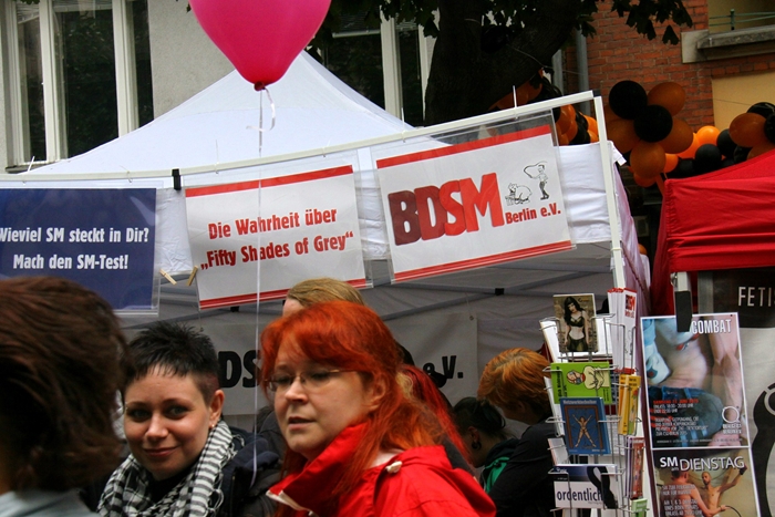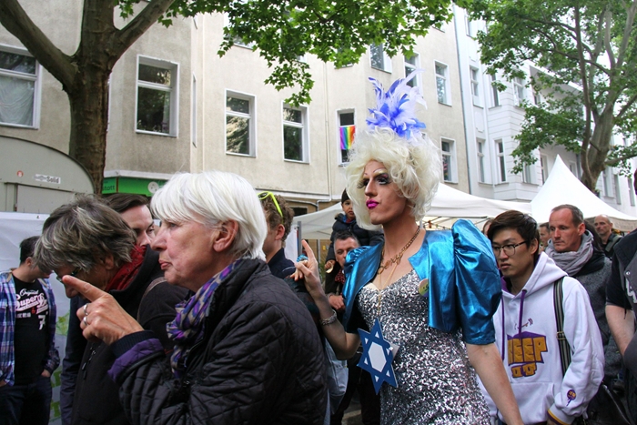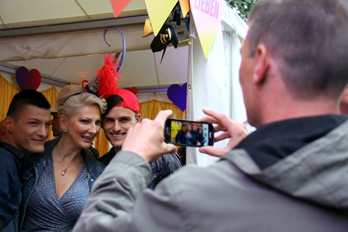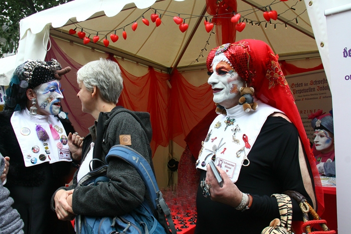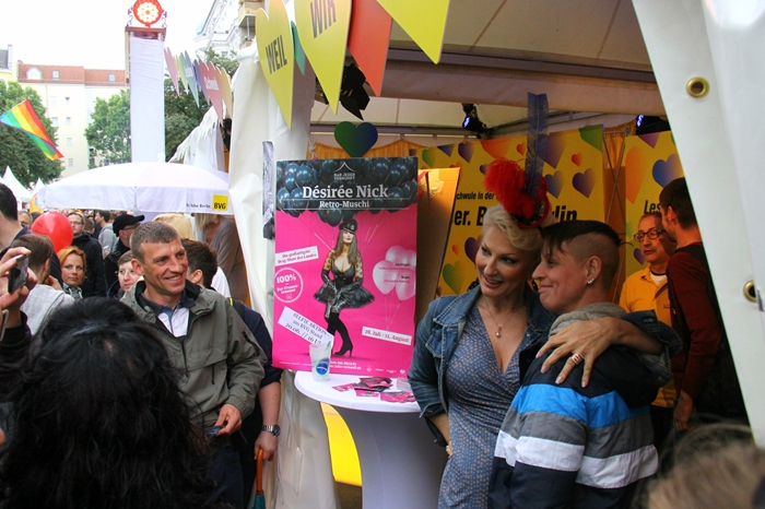 На всех прилегающих улочках все заставлено палатками и стендами всевозможных ЛГБТ-организаций, политических партий, развлекательных заведений, медицинских учреждений, просветительских центров. Тут и специализированные масс-медиа, и представители полиции, и болельщики «Герты»… С нескольких сцен звучит музыка, есть, где посоревноваться, хоть в шахматах, хоть в стрельбе, есть, где выпить и закусить. Как всегда, не обошлось без политиков – была встреча с экс-бургомистром Берлина Клаусом Воверайтом (Klaus Wowereit).