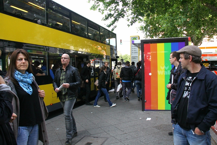 Июнь – месяц для Берлина особый. Именно в июне проходит большое количество самых разнообразных мероприятий, организованных представителями ЛГБТ. Одно из таких мероприятий – городской фестиваль лесбиянок и геев, который состоялся 20-21 июня уже в 23-й раз на Ноллендорфплац. Эта площадь еще с начала прошлого века известна повышенной концентрацией людей, чьи сексуальные пристрастия принято считать нетрадиционными, а также кафешками и магазинами, рассчитанными именно на таких людей. Станция метро Nollendorfplatz – тоже особая. Тут есть мемориальная доска «Розовый треугольник» в память о гомосексуальных жертвах национал-социализма. Сама станция украшена радужной иллюминацией, а недавно даже находящуюся тут автобусную остановку раскрасили цветами радуги и назвали «Остановка толерантности».