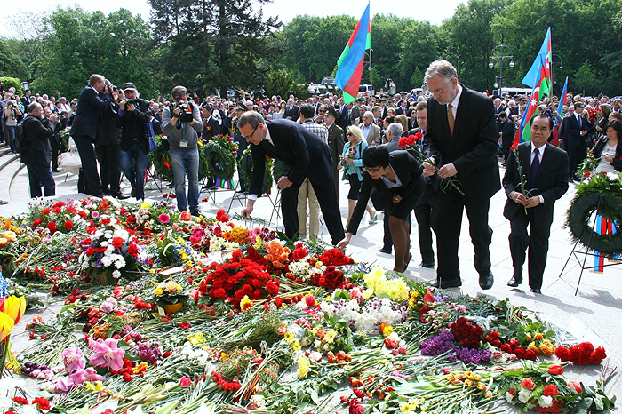 Не было в этом году традиционного длинного строя военных атташе зарубежных стран. Вероятно, их просто было значительно меньше, чем в прежние годы. И представителей дипкорпуса, скорее всего, из-за ситуации в Украине, было меньше. Уверен, что не только представители Украины не захотели в это день вспоминать погибших во Второй мировой войне плечом к плечу с Россией, ведущей агрессивную международную политику. Не заметил я в очереди на возложение цветов организованных нарядных школьников и кадетов с медалями. Еще я обратил внимание на то, что пока послы были на мемориале, российских флагов в толпе было совсем мало, азербайджанских было и того больше. Скорее всего, это тоже не случайно.