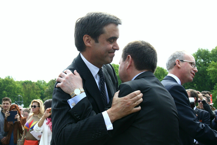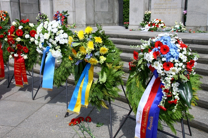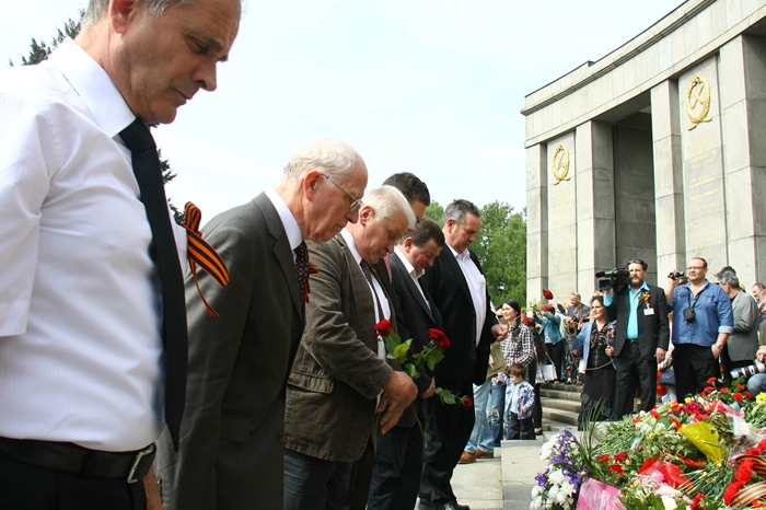 Собственно, исходя из всего вышесказанного, ничего особо нового в этом году в Тиргартене я не увидел. Сама церемония возложения венков послом России и представителями зарубежного дипкорпуса была несколько иной. Все было по-европейски – послы не шли за венками, а подошли к уже установленным и просто поправили ленточки на них. После этого они выстроились в строй и молча стояли. Тут и возникла некоторая накладка. Народ, привыкший к музыке и безудержному веселью, не понял этот молчаливо-скорбный момент, и из толпы раздались возгласы, типа, что за тишина, позор России и т.д. Вы можете несколько таких реплик услышать в начале снятого нами видео. Я думаю, что российское посольство решило быть в общеевропейском тренде празднования юбилейной даты, что, конечно, правильно, но не все из присутствующих на Мемориале оказались к этому готовы.