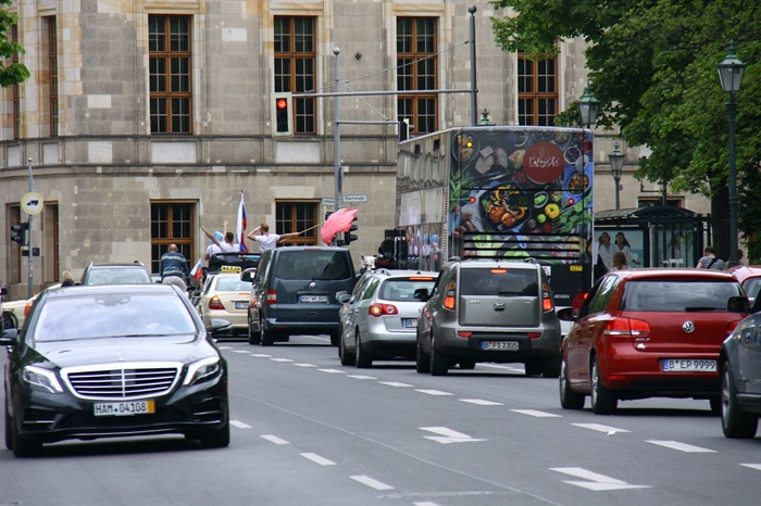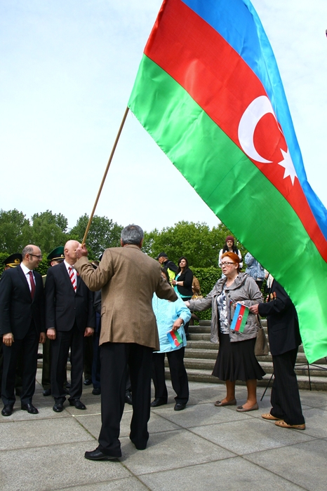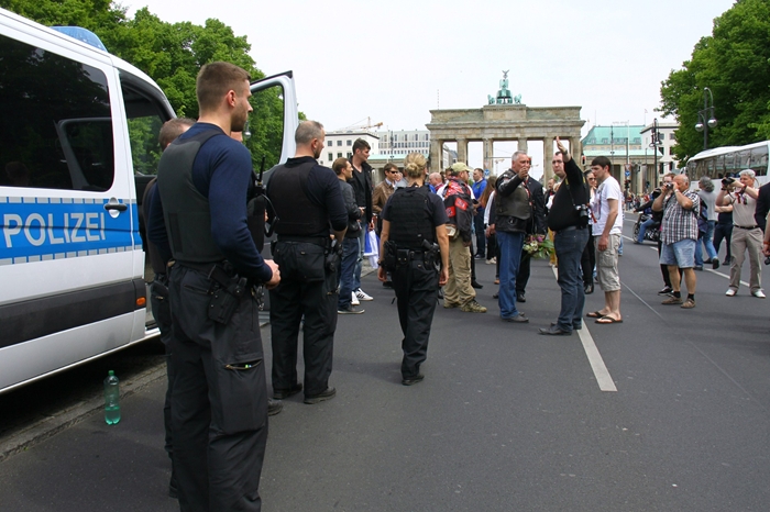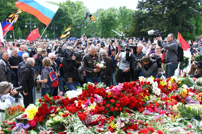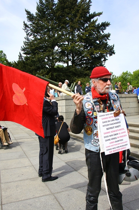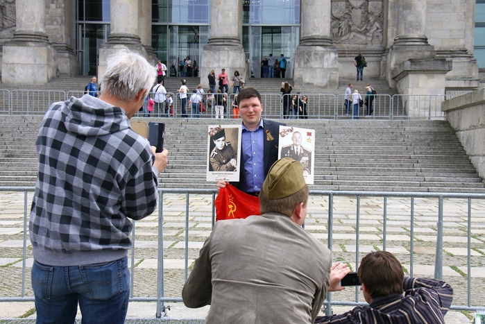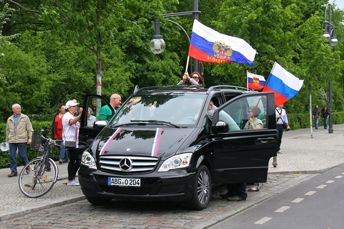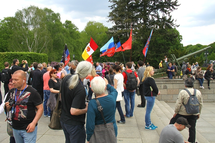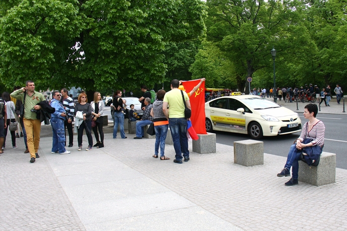 Некоторые утверждают, что очень много немцев празднует этот день вместе в русскоязычными берлинцами и гостями города. Я бы не стал так утверждать. Да, немцы были, кто – по долгу службы, кто – по зову сердца. Последние – это, прежде всего, представители левых движений, призывающие не допустить новой войны с Россией. Да и всевозможных мероприятий 9 Мая немцами подготовлено было не мало. Но ни о каком массовом присутствии немцев на мемориале Тиргартене речь точно идти не может. И опасливые взгляды на толпы «вежливых людей», размахивающих красными знаменами у стен Рейхстага, я тоже заметил.