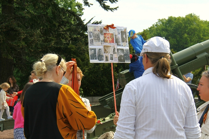 Цветов традиционно было очень много. Обязательные георгиевские ленточки всем желающим раздавали, но преобладал все же красный цвет. После ухода послов флагов СССР и копий Знамени Победы заметно прибавилось. Еще через какое-то время ввысь взметнулись флаги «Новороссии», «ДНР», «ЛНР» и других пока несуществующих «республик». Много людей пришли в пропагандистко-патриотических футболках – тут и Путин во всех видах, и «рожденные в СССР», и «вежливые люди», и «Крым наш»… Немецкие и чилийские коммунисты, плакаты за мир, листочки с благодарностью советским солдатам за их подвиг… Девочки в солдатских пилотках с налепленными на них шевронами разных родов войск… Проносящиеся машины с российскими триколорами и советскими флагами… Тема «Назад в СССР» явно преобладала.
