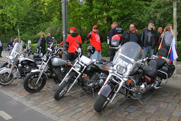 Сразу скажу, что полиция разбила всех байкеров на группы, поэтому в Тиргартене были далеко не все. Как они ехали одной большой группой по Берлину, я не видел. Никто даже не может сказать, сколько всего мотоциклистов было. Они и сами этого не знают. Кто-то говорил, что несколько сот, кто-то, что тысяча. Для большинства берлинцев все они были «волками» или сочувствующими им. Хотя это не так. Например, «черные медведи» из Рыбинска от «волков» дистанцировались, у них была своя программа. Был и мотопробег, в котором участвовали ребята и девчонки из России, Украины и Беларуси. Сколько, вообще, самых разнообразных мотоклубов было в эти дни в Берлине, не скажет никто, но очень много. Сначала я даже начал фиксировать на камеру все надписи и нашивки на куртках, но быстро прекратил это делать, осознав объем работы.