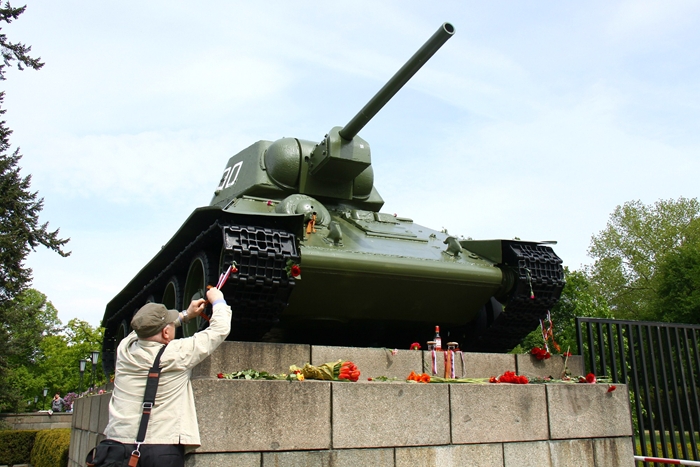Возможно, изначально все силы по празднованию нынешнего Дня победы в Берлине были смещены от Тиргартнена в Трептов парк. Повторяю, говорят, что там было очень многочисленно. В Тиргартене, на первый взгляд, все было, как обычно, но все же – не так. Не так шумно, что ли. Не так многолюдно. Не было музыкантов, не было танцев, даже многочисленных компаний, поднимающих тосты за Победу и вкусно закусывающих, я не заметил. Нет, наверняка, люди водку с собой приносили, просто на гулянки тут не задерживались – клали цветы и шли дальше. Пьяных практически не было. По крайней мере, я видел только одного сильно принявшего на грудь. Молодой человек в армейском кителе взобрался на танк, а вот слезть с него долго не мог. Кстати, в прошлом году наблюдал аналогичную картину.