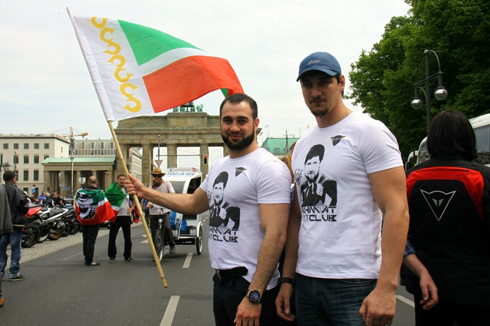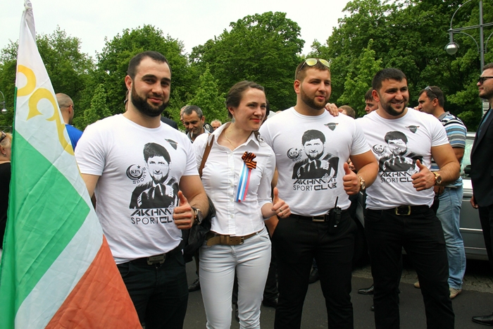 Несколько «ночных волков» все же в Тиргартен приехали. Их сразу же окружили желающие с ними сфотографироваться. Один «волк» был с медалью за Крым, хвалил Путина и говорил, что они никого не боятся. Тут же сразу оказались и поддерживающие «волков» спортсмены-чеченцы, сторонники Кадырова.