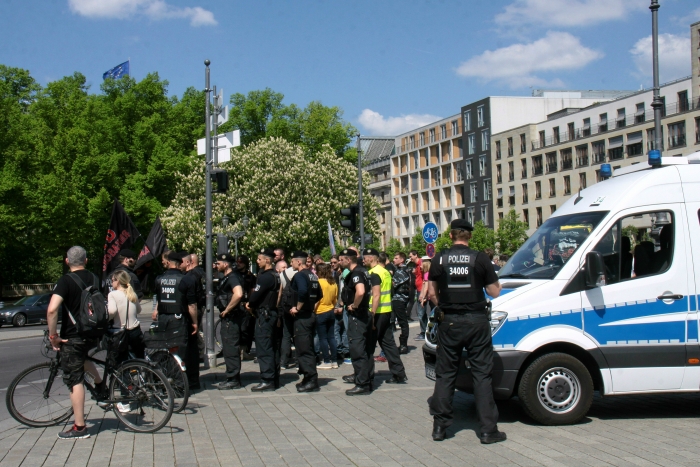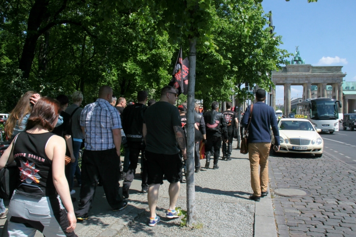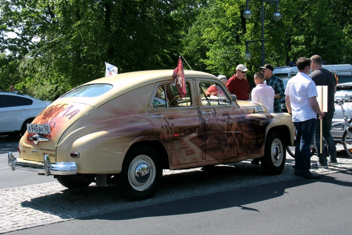 На Мемориал павших советских воинов в Тиргартене колонна прибыла из Трептов-парка с опозданием – попала в пробку. Кроме мотоциклов фотографов порадовали разрисованный автомобиль «Победа», да милицейский «Москвич». Как сказал вашему корреспонденту один из «ночных волков», в Берлин приехали около 200 байкеров, и еще сотня добавилась тут.