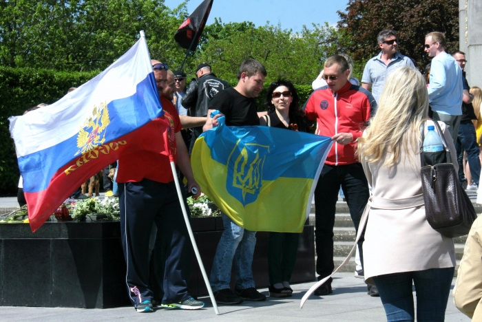 «Ночные волки» возложили к мемориалу цветы, преклоняя при этом колени. Церемонию сопровождал почетный караул из двух солдат в старой военной форме – польской и советской. Поляки подарили российскому «ночному волку» шашку со штыком, а он в свою очередь пообещал приехать в Берлин и в следующем году, после чего все прокричали «волковские» два отрывистых и одно раскатистое «ура». Кстати, привезли они и украинский флаг, и еще один украинско-белорусский флажок я увидел в руках у приехавшей с ними девушки.