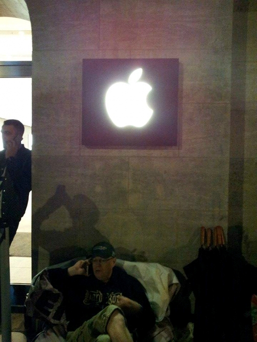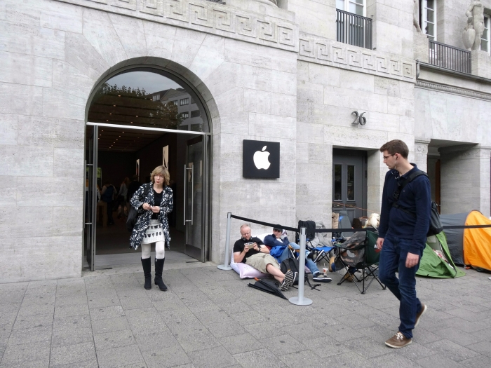 Хольгер сидит у магазина Apple Store Berlin с прошлой пятницы, то есть уже шесть дней. Место у него самое козырное – прямо у входа. Он сидит там вместе с другом за компанию. Друг специально прилетел из Москвы. До начала продажи осталось два дня. Может быть, станет самым первым покупателем новой модели.