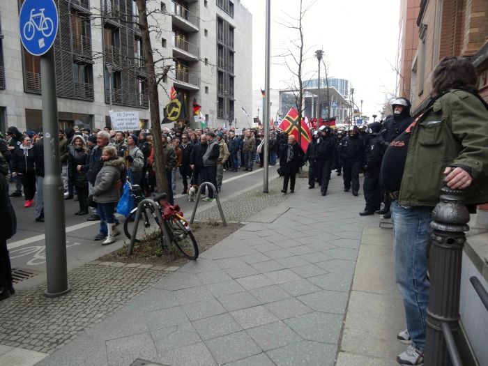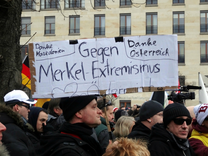 12 марта в Берлине прошла большая демонстрация под лозунгом «Меркель должна уйти». Три тысячи человек, представлявших правые силы, а также тех, кто просто не разделяет политику федерального канцлера Германии в отношении приема беженцев, стартовав от Главного железнодорожного вокзала, прошли по правительственному кварталу и финишировали у Бранденбургских ворот. Среди протестующих были представители движения «ПЕГИДА» (Patriotische Europäer gegen die Islamisierung des Abendlandes), партий «Альтернатива для Германии» (AfD) и НДПГ (NPD), различных ультраправых и маргинальных группировок. Поражало разнообразие флагов, среди которых был замечен и российский.