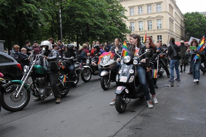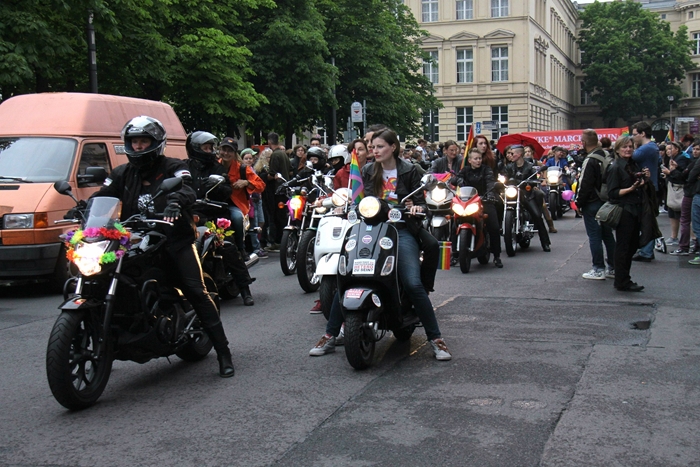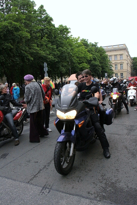 Впервые в Берлине во главе марша ехала группа мотоциклисток, что, конечно же, выглядело очень мужественно. Некоторые семьи пришли с детьми.