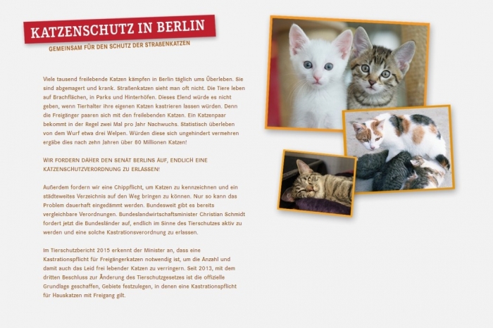 Новая кампания Tierschutzverein für Berlin также требует ликвидации расового отношения к списку пород собак и улучшению их содержания в городе. Владельцы собак должны быть больше осведомлены о своих обязанностях. Хоть в Берлине уличных кошек и не видно, но они есть, и их немало. Тут работа организации будет направлена на кастрацию животных, чтобы уменьшить их количество. Волнует защитников животных и тяжелая жизнь лошадей в городе. Ведется многолетняя борьба за запрет конных экипажей в Берлине. Пока же лошади не должны работать больше девяти часов в день, они должны отдыхать в специальных местах города и есть качественную еду. Не остаётся в стороне внимания зоозащитников и цирк. Так они требуют запретить участие в представлениях диких животных, которые страдают физически и психически.