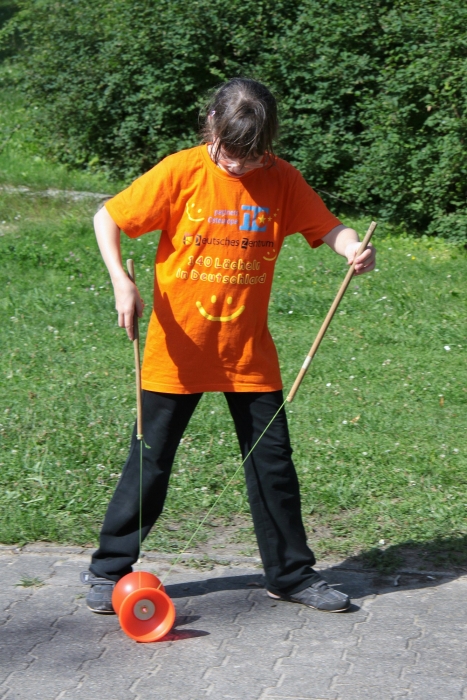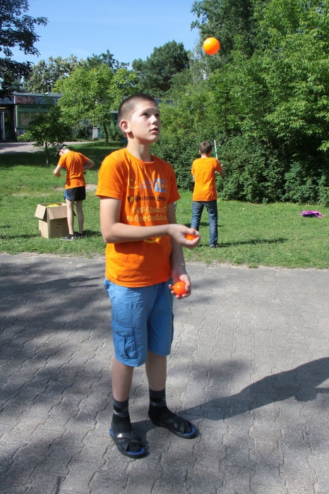 Я уже успел оценить то, чему научились ребята всего за один день, благо учителя у них хорошие. Несмотря на то, что когда я приехал в лагерь, занятия уже закончились, один из них – Филипп Якомайер (Philipp Jakomeyer) быстро организовал групповую фотосъемку, и дети опять с удовольствием носились со своими шарами, булавами и йо-йо.