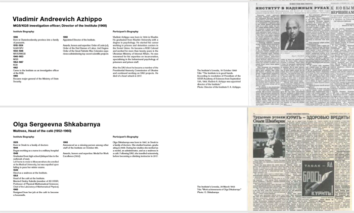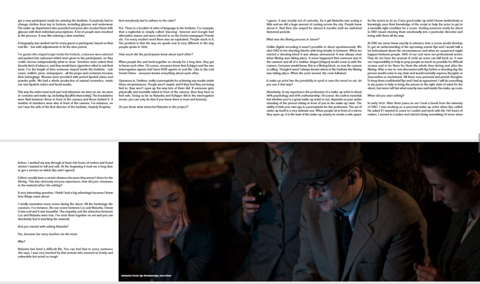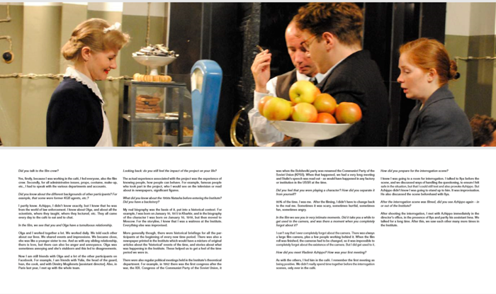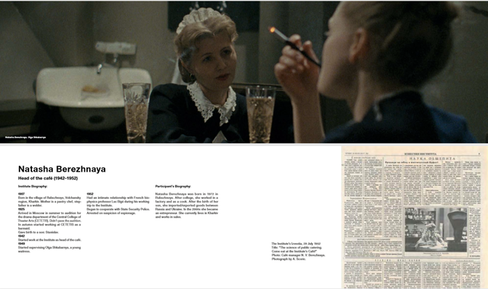 – Они находились внутри обстоятельств, внутри обстоятельств мира этого института. Находились в разных взаимоотношениях друг с другом. Они занимали разные позиции. Например, когда мы кастинговали Наташу, мы много времени с ней разговаривали, вначале ассистенты, потом я, гримировали, смотрели, какую профессию она может получить в институте. И довольно быстро мы поняли, что она может стать, например, буфетчицей. Вот так она стала буфетчицей, сформировался буфет. И тут у нас появляется физик, он и идёт в лабораторию работать физиком. Кто-то является, например, бывшим сотрудником системы исполнения наказаний, следовательно, он идёт в первый отдел работать, или в охрану.