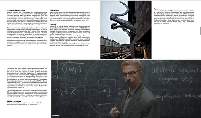 О проекте «Дау» в последнее время написано столько, что повторять здесь хоть что-то об этой работе не имеет никакого смысла. Мне вообще тяжело не то что осознать всю масштабность этого проекта, а элементарно поверить в то, что он был осуществлён. А был же! Огромное количество людей, по воле случая ставших актёрами, мировые звёзды, политики и знаменитости долгое время жили на закрытой, специально построенной территории, в другой эпохе, где они говорили и делали, что хотели, а их снимали, когда хотели. Без сценария. И всё это каким-то непостижимым образом завязано на Льве Ландау и Институте физических проблем АН СССР. Непостижимо! Это реально какой-то масштабный эксперимент, который наверняка войдёт в учебники о кино.