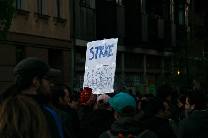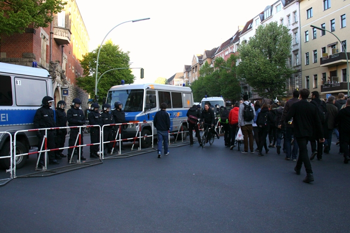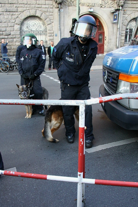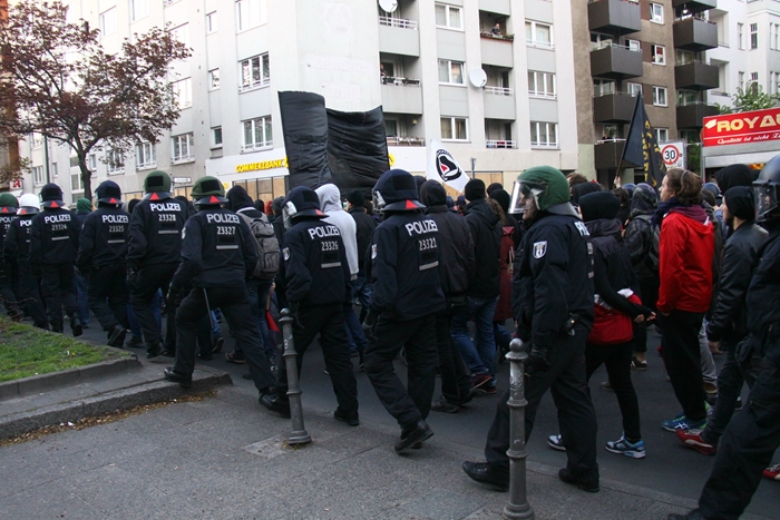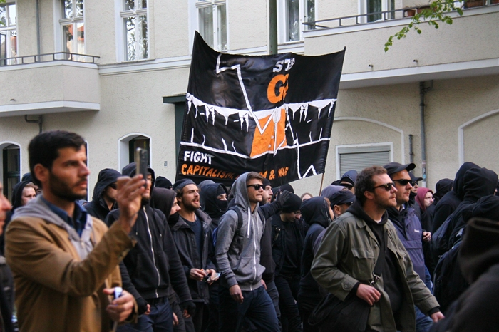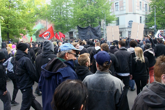 А в это время самые социально активные представители молодежи уже собирались на свою 25-ю революционную демонстрацию. Пожалуй, это самая главная протестная акция года, которая объединяет антифа, автономов, панков, представителей некоторых зарубежных диаспор, реально обеспокоенных качеством своей жизни людей. Главный клич не меняется: «А-анти-антикапиталиста!». Представители «черного блока» прячутся за капюшоны, солнцезащитные очки и плакаты, полиция надежно закрывает улицы по ходу движения колонны. Демонстранты сразу набирают большой темп, взрываются петарды, фотографы и видеооператоры пытаются сделать кадр получше и при этом не нарваться на раздачу. Как я уже неоднократно писал, «черный блок» в кадр попадать не любит, поэтому людей с камерами терпеть не может. Вот и в этом году мне опять били по камере и пытались выбить ее из рук, что вы можете увидеть на видео. Наблюдал я, и как в фотоаппарат одного из фотографов плеснули пивом, а потом окружили его и что-то агрессивно доказывали. Лично мне это непонятно. Известно, что полиция все эти демонстрации фиксирует на видеокамеры, полицейских операторов на крышах, извините за каламбур, выше крыши. Сделать любой кадр крупным планом даже с большого расстояния, сейчас совершенно не проблема. Так какой смысл так прятаться от фотокорреспондентов? Каждый раз, видя на сделанном снимке направленное в объектив злобное лицо, у меня возникает один и тот же вопрос: ребята, а где же ваша смелость? Не по-революционному это как-то! Вы же мните себя революционерами, готовыми изменить весь мир, тогда зачем вы одеваетесь в одинаковую черную одежду, прячетесь за масками и мешаете прессе работать? Боитесь – сидите дома, не боитесь – тогда не шифруйтесь. Мне как-то сложно представить, чтобы настоящие революции делались людьми в балаклавах. Или весь пыл уходит в бросание камней и краски в полицию, вырывание дорожных знаков и битье витрин и стекол на остановках? Так это не революция, это обычное хулиганство. Вот утащить по дороге стул из кафе – это, вероятно, очень революционно, это настоящая борьба с капиталом. Так можно еще не один раз по 25 лет выходить на улицы, и ровным счетом ничего в государстве не изменится…