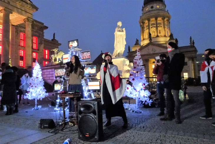 Вечером на самой красивой площади столицы Германии – Жандарменмаркт – она встретилась с представителями беларуской диаспоры и всеми, кто поддерживает стремление народа Беларуси к свободе, кого возмущают жестокие действия режима Александра Лукашенко. Акция была организована объединением проживающих в Германии беларусов RAZAM, поддерживающим соотечественников в их борьбе за свободные выборы и за прекращение государственного насилия в Беларуси.