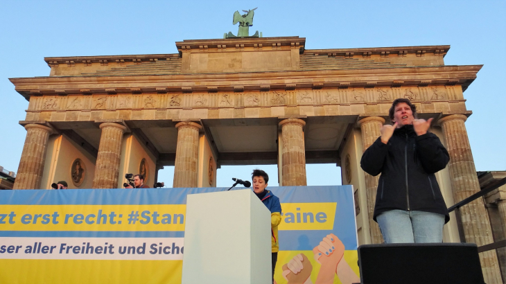 Für unsere Freiheit. Für ein starkes Europa («Зараз як ніколи: #standwithukraine. За Укріану. За нашу свободу. За сильну Європу»). Її організаторами виступили берлінська українська організація Vitsche e.V. і німецька громадська організація Campact