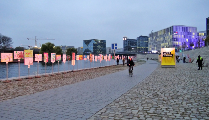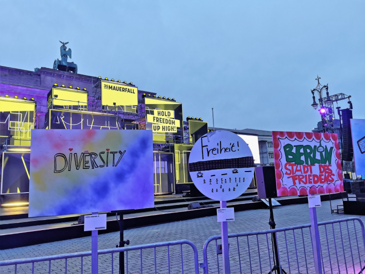 транспаранти. Усі охочі могли отримати в подарунок книгу «35 Jahre Mauerfall.