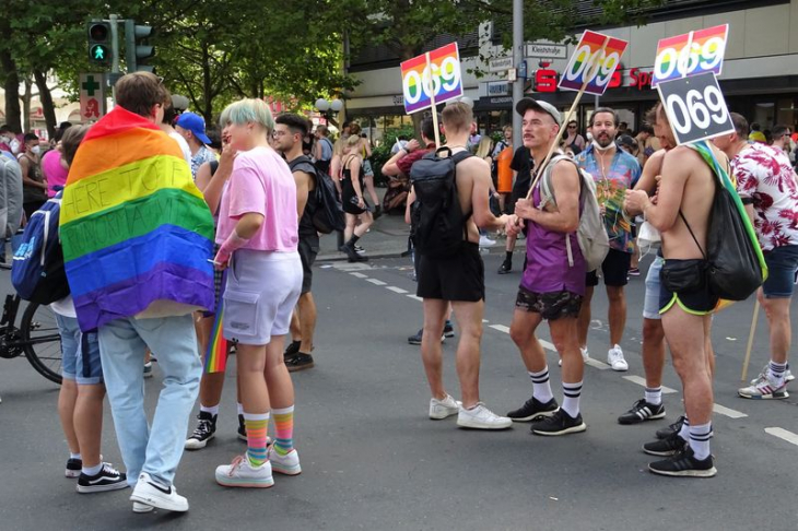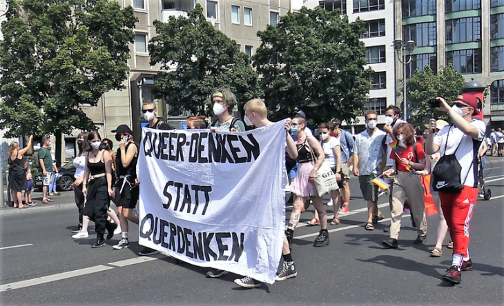 ЛГБТ под полотнищем «Германия, куда? Назад к Богу!». Стояли тихо, без
