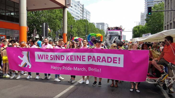 на главном транспаранте: «Мы не парад! Счастливого прайд-марша, Берлин!».