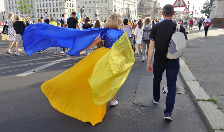 улицам, украшенными украинскими флагами в поддержку Украины, борющейся с