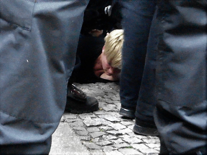 В 12 часов дня, когда демонстрация должна была уже начаться, на Карл-Маркс-Плац вместо заявленных 150 участников было всего несколько человек. Зато было много полиции, в том числе в штатском. Их выдавали наушники в ухе и торчащие из карманов брюк перчатки.