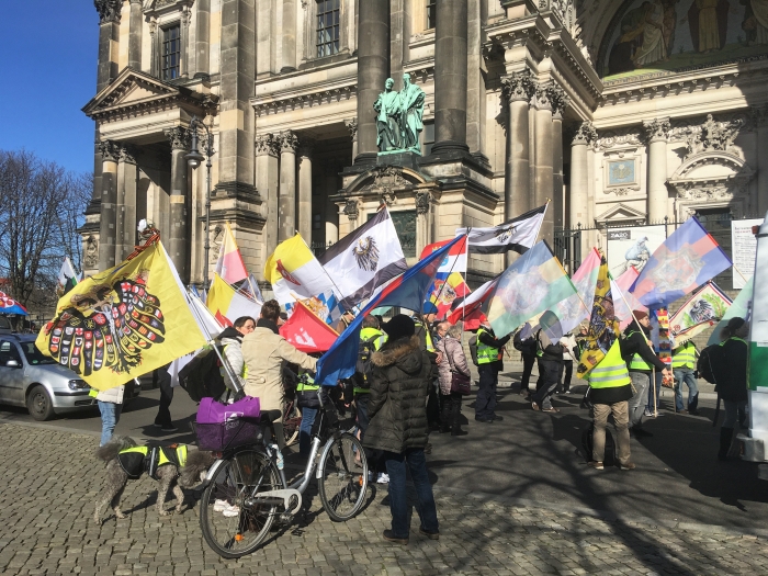Ну и какой Берлин без протестных акций? Вот и в эти, непростые для жителей города времена, без них никак. Находясь 14 марта в центре города случайно увидел одну из них. Меня заинтересовали люди с георгиевскими лентами, что и заставило подойти поближе. Оказалось, что это акция за мир и дружбу, организованная небезызвестной общественной организацией Staatenlos.info e. V., чей пророссийский характер давно известен. Члены организации считают, что Вторая мировая война до сих пор не окончена, ФРГ – это не Германия, она нелегитимна и является «мотором» фашизма и нацизма в Европе, суверенная Германия без России невозможна, гражданства ФРГ по факту нет. Одним словом, необходимо освободить Германию и Европу от фашизма и нацизма, дружить с Россией, и будет тогда мир во всём мире. Возглавлял немногочисленное шествие сам инициатор акции Рудигер Хоффманн (Rüdiger Hoffmann), известный своими постоянными призывами штурмовать Рейхстаг.