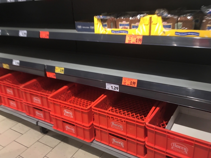 Какая-то тревожность ощущается и в магазинах. Люди начинают запасаться продуктами питания и предметами личной гигиены, то ли ожидая возможного дефицита самых необходимых товаров, то ли в целях минимизации своего нахождения вне стен дома. При этом немцы, славящиеся своими рационализмом и экономностью, пока что сметают с полок лишь самые дешёвые и уценённые по акции макаронные изделия, пиццу, консервы и всё, что может до лучших времён полежать в холодильнике или в кухонном шкафу. Впрочем, в Германии давно привыкли экономить не только немцы.