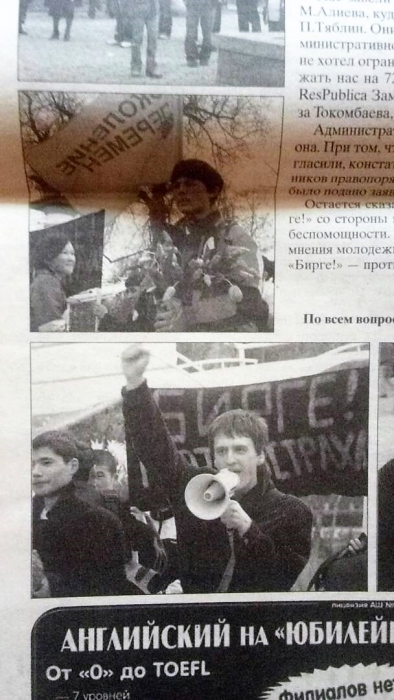 Сейчас оглядываясь назад, вижу сколько адреналина в нас было. И на самом деле, когда начался митинг, мы радостно появились из ниоткуда и маршем пошагали к центру событий. С жёлтым флагом, шарами и плакатами. Площадь Победы. Собрались перед цветочным магазином на улице Шопокова. Пришли солидарные с нами Эдиль Байсалов, Клара Ажибекова. Мы все жаловались на угнетающую ситуацию, на нечестные выборы, на жизнь народа, как люди обнищали, и куда идёт страна. От СМИ пришли «МСН», и Владимир Пирогов очень тщательно нас снимал. Нас очень тесно сжали, но мы продолжали не поддаваться на провокации. В этом и была суть мирного сопротивления. На том митинге к нам присоединилось ещё больше молодёжи.
