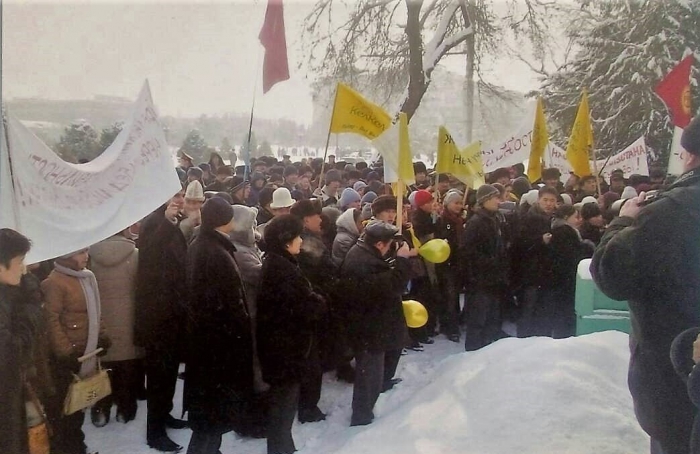 Первый раз я тогда увидела правозащитника Турсунбека Акуна, который был профессионалом митингов, и мне было радостно наблюдать его столь близко. Ничего себе, обычный человек, подумала я. Там были и другие молодые люди, и только с парой человек я была знакома. Многие были из кыргызского НПО сектора, из женского общественного объединения «Эрайым». На следующий день мы уже вышли перед ЖК. Зима, холод, нас поили чаем из термоса. Я чувствовала солидарность и то, что мы встали в путь мирного сопротивления. Сотовые телефоны тогда только появлялись, и было дорого много звонить.