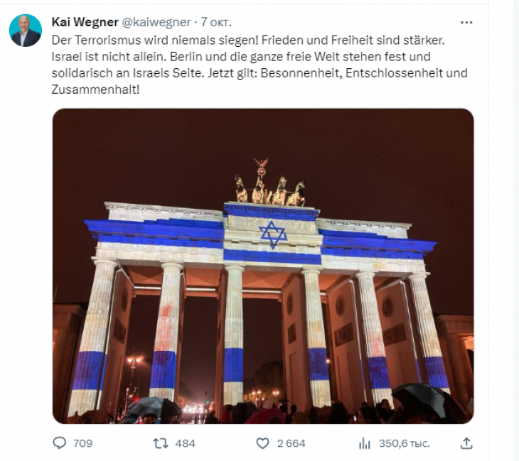 государством Бранденбургские ворота были освещены цветами израильского флага.