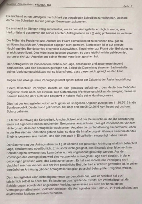 То, что Дмитрию опасно возвращаться в Россию, понятно любому, но вот BAMF находит причины отказать в политическом убежище на том основании, что будто бы были нарушены сроки интервью, линки на публикации в российских СМИ не активны, да и, вообще, некоторым представленным документам верить нельзя.