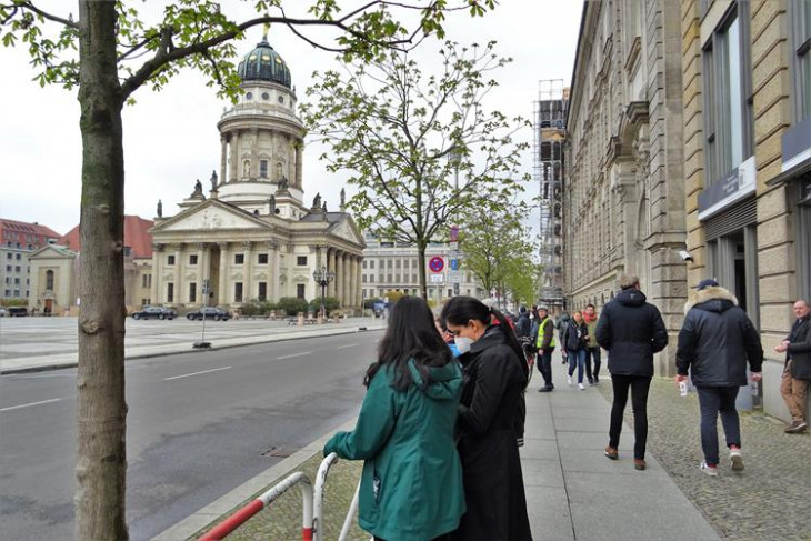 18 апреля в Берлине прошли траурные мероприятия, посвящённые памяти жертв пандемии коронавируса. Так в Концертном доме на Жандарменмаркт состоялась панихида по 80 000 человек (во всем мире их более трех миллионов), умерших от этой болезни в Германии. Участвовавших в ней президента Германии Франка-Вальтера Штайнмайер (Frank-Walter Steinmeier), канцлера Ангелу Меркель (Angela Merkel), председателя бундестага Вольфганга Шойбле (Wolfgang Schäuble) и других важных лиц надёжно прикрыли со всех сторон полицией. Более того, на Жандарменмаркт и Брайтшайдплац вообще запретили демонстрации, чтобы первые лица государства ничего плохого в свой адрес не услышали. Но и этого показалось мало, поэтому полицейские кордоны отодвинули как можно дальше, да и немногочисленных зрителей от них тоже отгоняли. На Жандарменмаркт был замечен всего один человек с плакатом, впрочем, проходившие мимо люди его активно поддерживали.