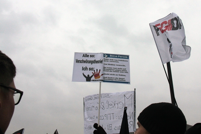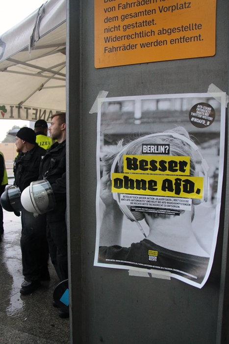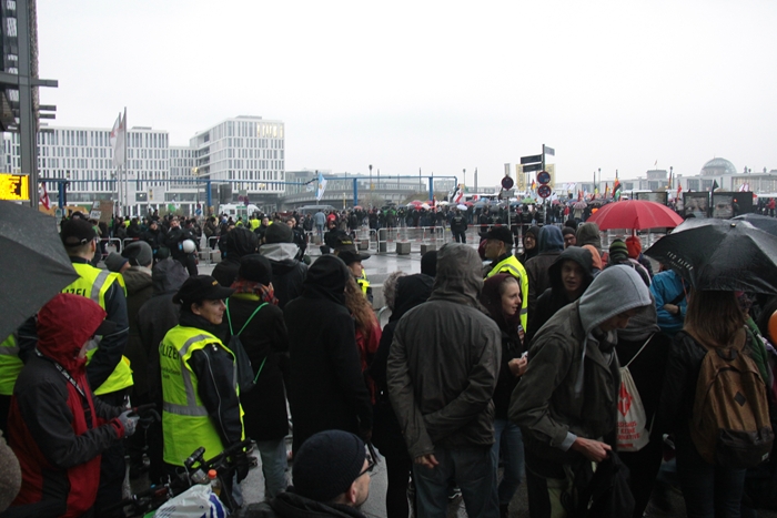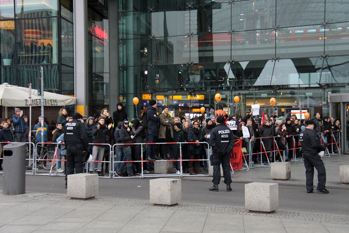 Ожидалось, что в этот день против политики Ангелы Меркель в отношении беженцев выступит 3000 человек, но реально было не больше тысячи. Таким образом, можно констатировать резкое снижение численности правых демонстрантов. Справедливости ради нужно сказать, что Берлин видел и куда большее количество левых контрдемонстрантов, которые, естественно, пришли, чтобы высказать свою позицию. Инициаторами этого выступили Berliner Bündnis gegen Rechts и Berlin Nazifrei. Противоборствующие группы, разделённые полицейскими ограждениями, находились на достаточно большом расстоянии, тем не менее постоянно пытались провоцировать друг друга плакатами, жестами, речёвками и песнопениями. Все противники Меркель традиционно именовались нацистами и им предлагалось убраться куда подальше, все сторонники приёма беженцев, в свою очередь, подпадали под определение «антифа». Не могу сказать, что среди правых демонстрантов кто-то особо выделялся своим видом, хотя присутствовали небольшие группы людей в тёмных очках и чёрных куртках с капюшонами на голове, видел я и одного человека в одежде от скандального бренда Thor Steinar. Что касается атмосферы, то на удивление руками никто от фотокорреспондентов не прикрывался и агрессии не проявлял, хотя традиционные обвинения немецкой прессы во лжи со сцены звучали.