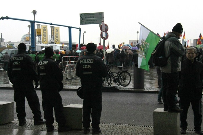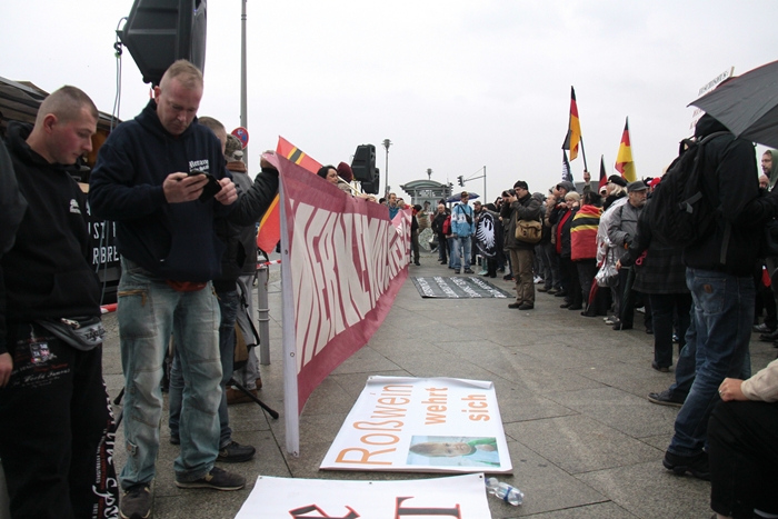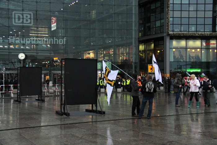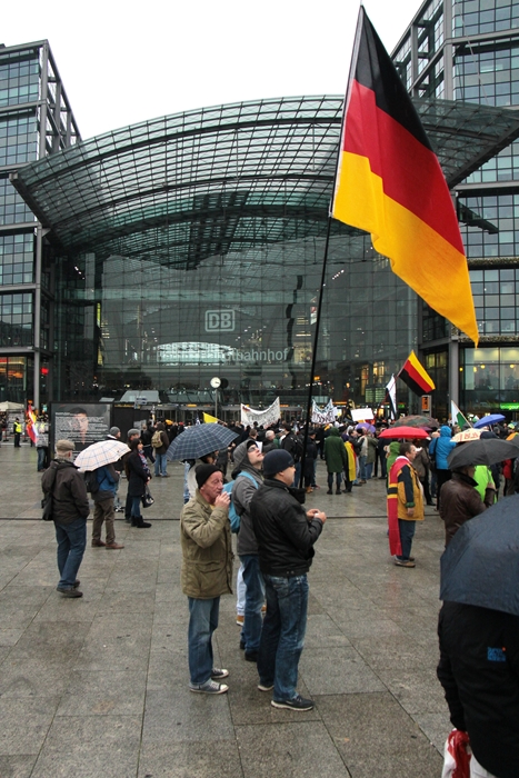 После окончания митинга у вокзала правые демонстранты пошли маршем на Александерплац. Усилившийся к этому времени дождь выбил некоторых бойцов из строя. Я тоже не пошёл по причине намокшей фотоаппаратуры. Скажу только, что по дороге была попытка 200 левых контрдемонстрантов заблокировать движение колонны, но полиция, увидев проявление недовольства правых, блокаду убрала и провела несколько арестов. В общем, всё как всегда…
