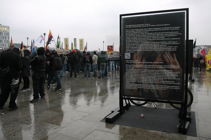 Нужно сказать, что идеологическое противостояние проходило на фоне фотовыставки Displaced. 12 Stories from Ukraine, открывшейся тут накануне. Как известно, в результате аннексии Крыма и боевых действий на востоке Украины насчитывается почти два миллиона вынужденных переселенцев. Фотографии Сергея Сараханова и истории изображенных на них людей уже были показаны в ряде городов Украины, в Брюсселе и Лондоне, и вот инициаторы проекта – канадская неправительственная организация Stabilization Support Services и посольство Великобритании при поддержке британского правительства – отправили экспозицию в новый европейский тур. После Берлина её увидят жители Гааги, Рима и Парижа. Задача понятная: показать европейцам конфликт на востоке Украины через реальные истории реальных людей, рассказать, кому конкретно идёт западная помощь, привлечь внимание к тому, что переселенцев нужно поддерживать, чтобы они быстрее нашли себя в новой жизни. К сожалению, участников демонстрации против политики Ангелы Меркель фотовыставка нисколько не заинтересовала, а кое-кто даже умудрился наклеить на один из стендов листовку движения PEGIDA, призывавшую прийти на следующую акцию, и какой-то стикер.