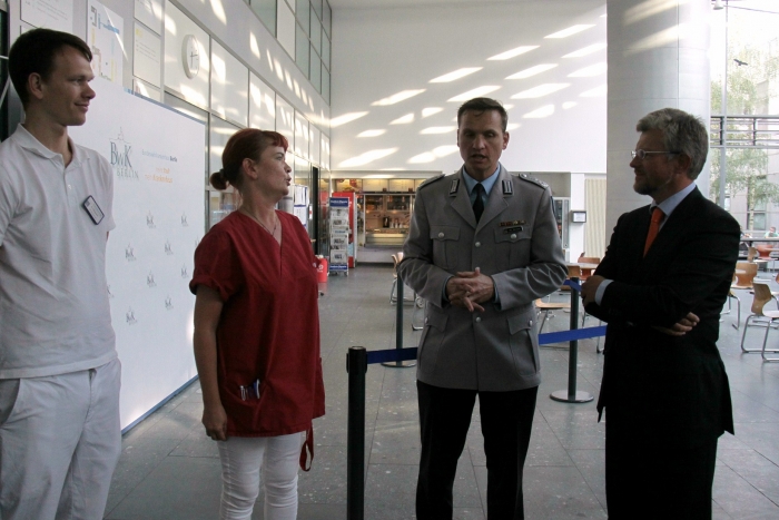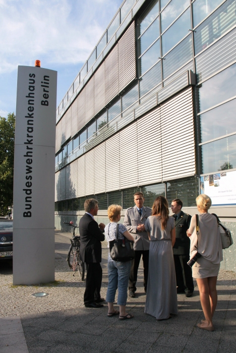 Встречать героев АТО прибыли военный атташе и сотрудники посольства Украины в ФРГ во главе с Чрезвычайным и Полномочным Послом Андреем Мельником, представители украинской прессы, а также волонтеры берлинской громады Берлина, обеспечившие перевод общения раненых с врачами.