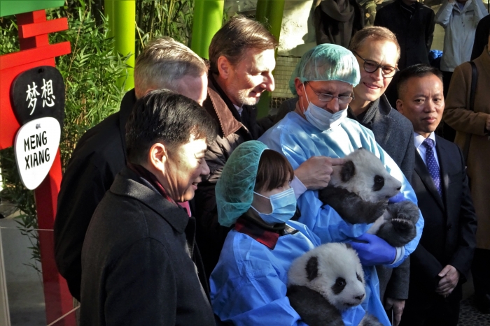 На праздничной церемонии выступили директор Zoo и Tierpark Андреас Книрим (Dr. Andreas Knieriem), правящий бургомистр Берлина Михаэль Мюллер (Michael Müller), посол КНР в Германии Ву Кен (Wu Ken) и заместитель начальника станции разведения панд из города Чэнду Цзинчао Лан (Jingchao Lan). Как только было озвучено то, что до последнего дня было строго охраняемой тайной, таблички с именами на китайском и немецком языках заняли своё место на входе в Panda Garden. Панд-близнецов назвали Мэн Сян (Meng Xiang) и Мэн Юань (Meng Yuan). Их имена означают мечту, к которой стремятся, и мечту, которая уже осуществилась. Очень символично, особенно для китайцев, верящих, что имена несут благословение и надежду.