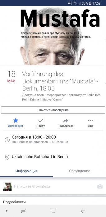 Дозвониться в посольство я не смог, на мои письма не отвечали. Организаторы акции – Berlin-Infopoint Krim и Initiative Qirimli – написали мне, что из-за 22 студентов, решивших также посмотреть фильм «Мустафа», мест для нас нет. Но нам разрешили прийти на мероприятие перед Бранденбургскими воротами.