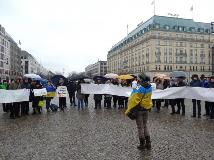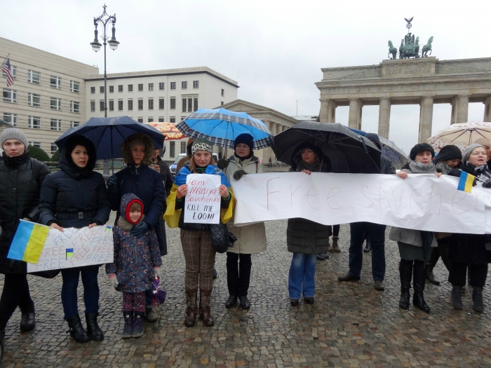 6 марта в Берлине, как и во многих городах Украины, России и ряда европейских стран, прошли акции в поддержку объявившей сухую голодовку перед вынесением приговора Надежды Савченко. Несмотря на непрекращающийся дождь, перед Бранденбургскими воротами собрались представители украинской громады Берлина, их немецкие друзья, а также люди из других стран. Нужно сказать, что два человека специально приехали из западных земель, чтобы присоединиться к акции протеста против действий российских властей. Был также замечен тут и автомобиль с украинским номером и тризубом на капоте, который сделал объезд Парижской площади. Водитель автомобиля поддержал демонстрацию лозунгом «Слава нации!».