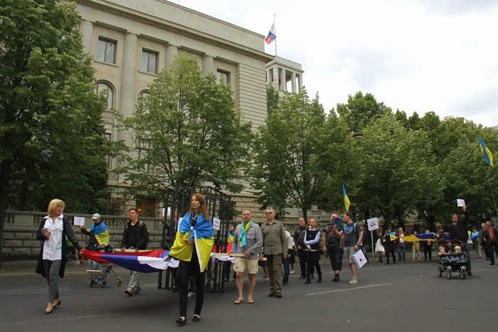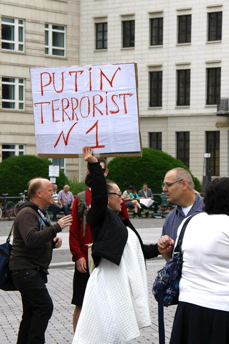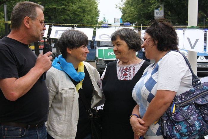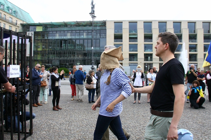 Возле Бранденбургских ворот усилиями артистов театра das dokumentartheater berlin была разыграна сцены событий на Майдане и заключение Надежды Савченко в российские застенки. После этого демонстрация проследовала к российскому посольству, где после митинга узница, которую, кстати, играла девушка из России, была освобождена. Этот момент оказался настолько эмоциональным, что Мария Ивановна не могла сдержать слез.