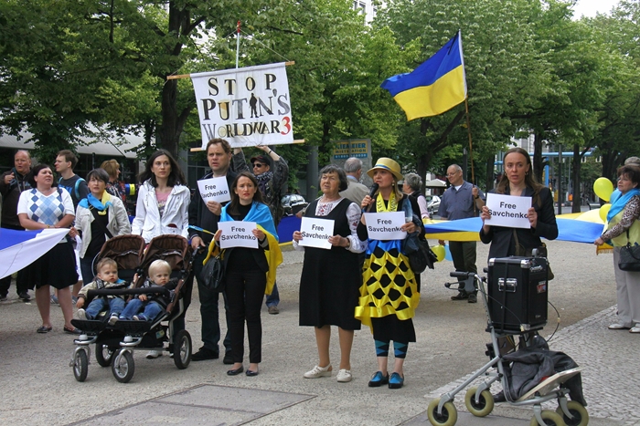 18 июня в Берлине состоялась акция, посвященная этой дате. Украинцы, немцы, русские, евреи и американец в который раз потребовали от Кремля немедленно освободить Надежду Савченко. К протестующим присоединилась и мама Надежды – Мария Ивановна, в очередной раз прилетевшая в Берлин для встреч с людьми, которые могут принять участие в судьбе дочери, а также Чрезвычайный и Полномочный Посол Украины в Германии Андрей Мельник.