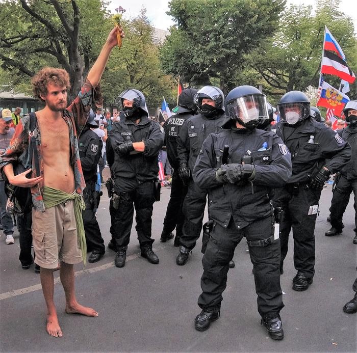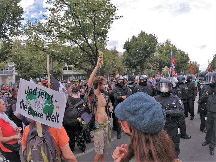 Это как раз тот случай, когда всё увиденное в этот день можно было бы охарактеризовать крылатой фразой Льва Толстого: «Всё смешалось в доме Облонских». В одном месте в центре столицы Германии собрались отрицатели коронавируса, противники сетей 5G, неонацисты, антифашисты, антиглобалисты, коммунисты, отрицатели Холокоста, противники Билла Гейтса и Джорджа Сороса, конспирологи QAnon, китайские правозащитники, борцы с режимом иранских аятолл, любители Путина и Трампа, сторонники идей Махатмы Ганди, апологеты мира во всё мире… Тут же люди пели и танцевали, лежали прямо на земле, демонстрировали разнообразные, местами очень креативные, плакаты. Уверен, что пришли, как действительно критически настроенные к действиям властей, так и те, кому уже просто наскучило сидеть дома, лишившись привычных мест развлечений. И не только из Берлина, но и из других немецких городов и даже из других стран. Вокруг ходили люди с флагами Германии, США, России, Израиля, Польши, Чехии… Со стороны это напоминало то ли всенародный праздник, то ли карнавал, то ли большой дурдом.
