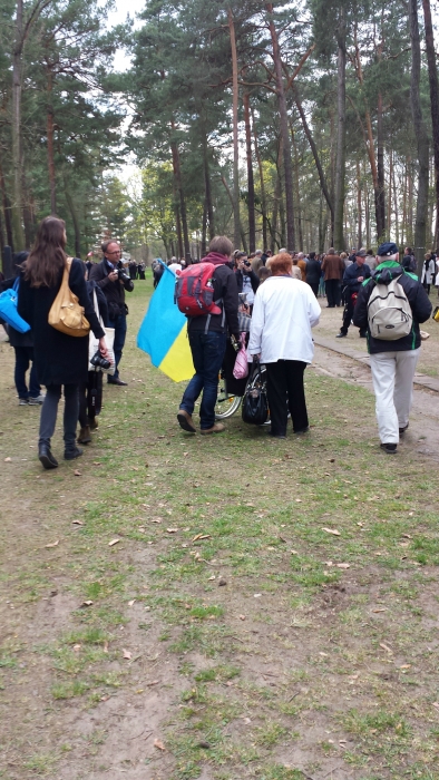 Позже началось возложение цветов к местам массовых захоронений, где каждая страна подходила к своей памятной доске со словами благодарности и преклонения перед подвигом жертв нацизма. Вначале мы пошли вместе с российской делегацией и услышали короткое выступление посла России в Германии Владимира Гринина и очень эмоциональный рассказ бывшего узника о братстве всех людей, невзирая на их национальность. Многие люди рыдали. Мои дети тоже заплакали, когда услышали, как ветеран описывал перенесенную им операцию без наркоза прямо в больничном бараке. К сожалению, я не знаю имени этого мужественного человека, но его друг и побратим – Владимир Воеводченко из Украины. Они обнялись и заплакали вместе. Восстановив дыхание, россиянин продолжил свою речь призывом жить в мире и дружбе, сказав при этом, что часть Украины с Россией, и что «фашизм не пройдет». На многих представителях делегации Российской Федерации были черно-оранжевые ленточки. Украинец Петр Федорович также возложил цветы и поклонился, встав с коляски и сняв с седой головы полосатую шапку. Доказывать что-то в этот день было совершенно ни к чему.