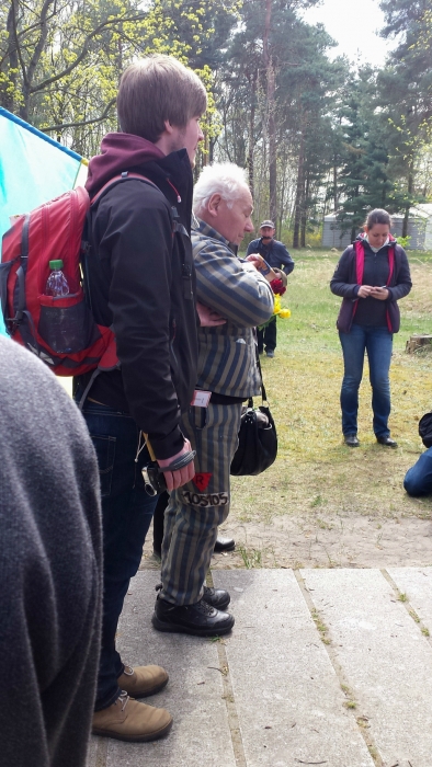По всей территории лагеря с небольшими паузами проходили различные действия с участием приглашенных бывших узников Заксенхаузена из разных стран, которых сопровождали, в том числе, и официальные лица. Первым, кто привлек наше внимание на пороге нового музея, был человек в полосатой робе на инвалидной коляске и, которому помогал передвигаться один из волонтеров.