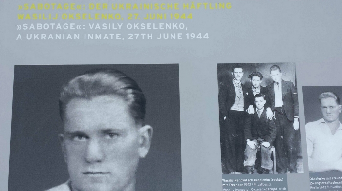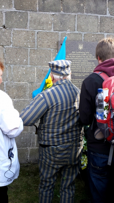 В момент, когда организаторы объявили, что теперь мы проследуем к месту памяти украинских и белорусских узников, к нам присоединились советник-посланник посольства Украины в Германии Василий Химинец и военный атташе посольства Андрей Ткачук. Возле нашей памятной доски с трезубом и текстом на украинском языке мы услышали истории наших двоих героических соотечественников. Подходили белорусы и поляки, говорили слова поддержки и также возлагали цветы. Было множество фотографов, которые ловили взгляды узников в объективы, задавали вопросы об Украине, удивлялись, что нас так мало.