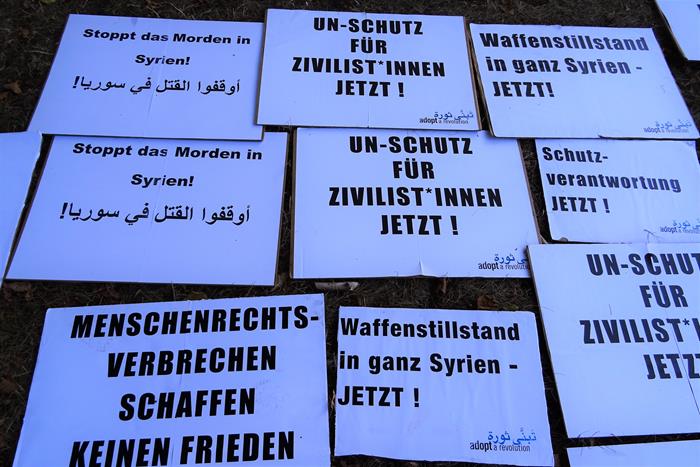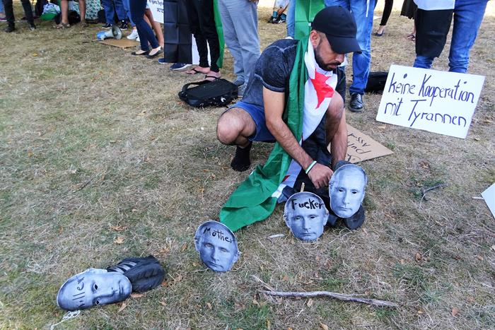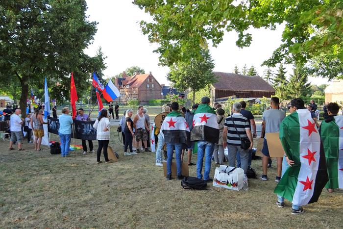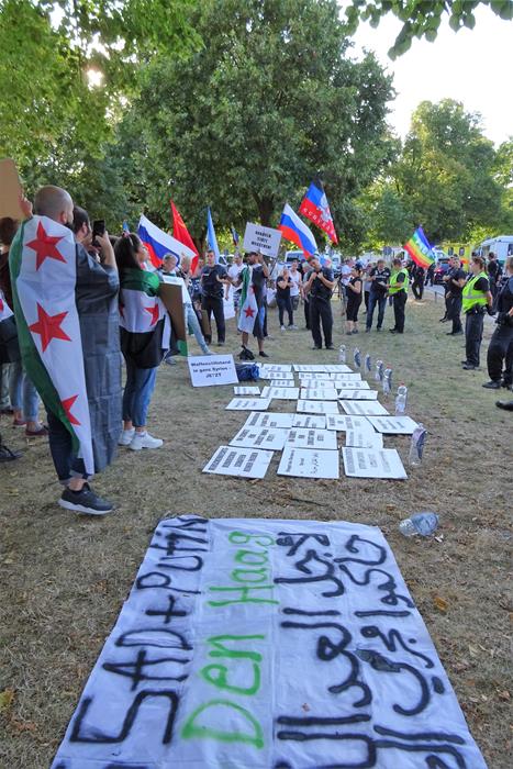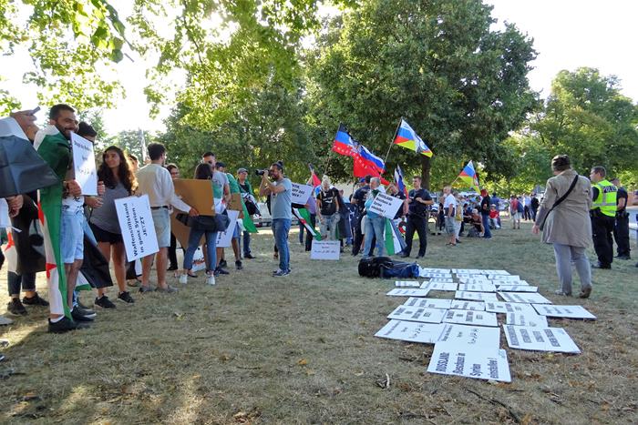 Почти сразу подошла и большая группа сирийцев, которые были основательно «вооружены» различными плакатами, и моментально стали кричать свои речёвки о том, что из Сирии должны убраться Россия, Иран и Хезболла.