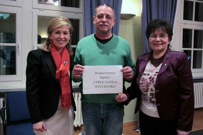Ну, а дальше все прошли за стол, и встреча началась. Берлинская активистка Татьяна Летаив поделилась своими впечатлениями о поездке на одно из последних заседаний суда по делу Надежды Савченко. Светлана Мельник выразила надежду, что наша Надежда вскоре будут освобождена, и призвала всех делать все возможное и невозможное для этого. Александра Хильдебрандт отметила, что главное сейчас сохранить жизнь символа украинского сопротивления российской агрессии. Закончился же вечер небольшим литературным чтением, во время которого одна из участниц встречи назвала трех, по ее мнению, выдающихся украинок, поразивших их современников своей внутренней силой – Лесю Украинку, Лину Костенко и Надежду Савченко.
