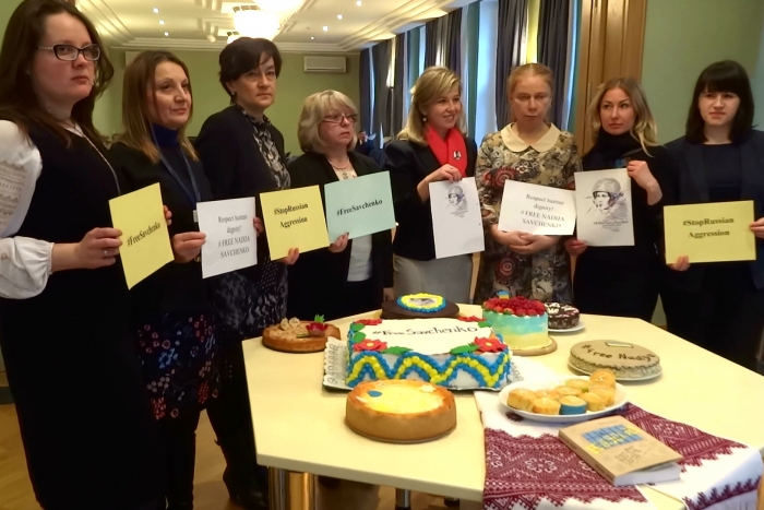 О чем еще хочется сказать относительно этой встречи. Когда фотографии тортов со словами поддержки Украины и Надежды Савченко стали достоянием общественности, кроме слов благодарности прозвучали и слова критики, мол, как так, в то время, как Надежда голодает, кто-то, вспоминая о ней, торты ест. Знаете, всегда можно спорить о форме поддержки или протеста. Нет ничего идеального. Но все же, не торты были во время этого вечера главным атрибутом. Главное было то, что женщины посольства Украины, отмечая международный женский день, привлекли внимание общественности к одной из самых ярких представительниц страны, которую нужно срочно спасать.